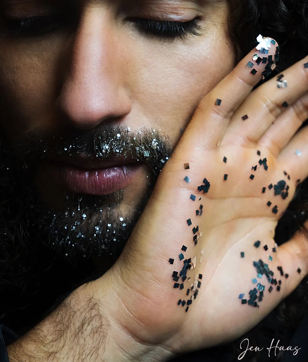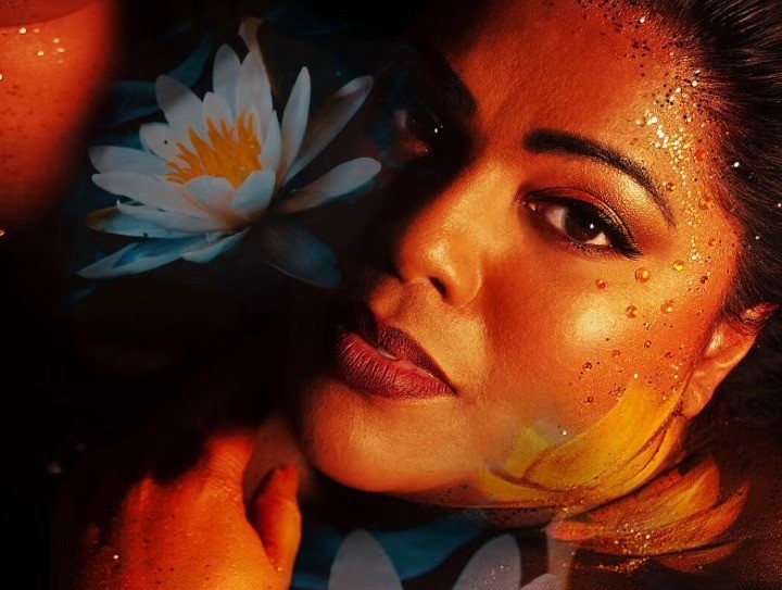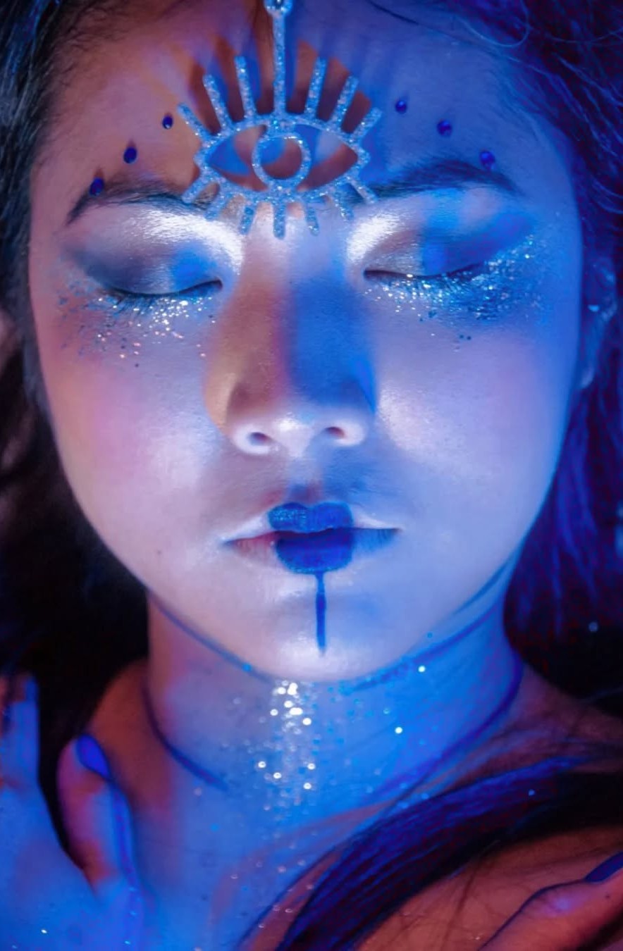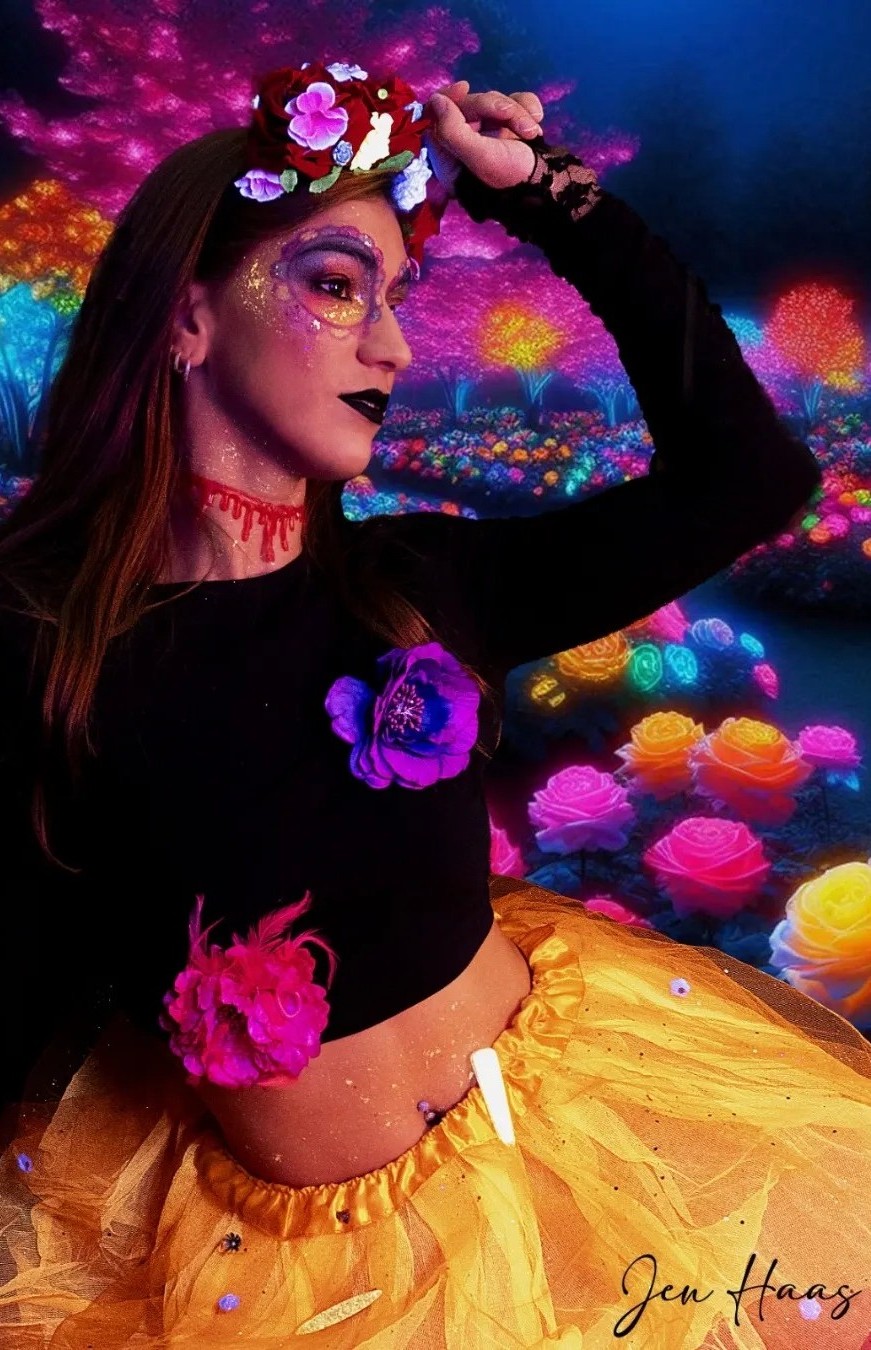 • 🎨 Une œuvre vivante : maquillage, peinture corporelle, paillettes et mise en scène artistique.